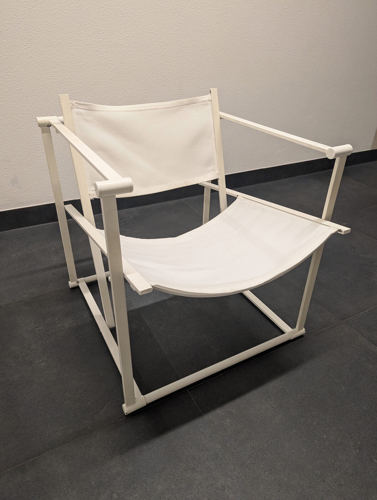 Set of 2 Pastoe FM60 “Kubus” armchairs, designed by Radboud van Beekum – a strong Dutch design classic with a clear geometric silhouette. The white lacquered metal frame combined with the white canvas seat and backrest gives the chairs a minimalist, architectural look that fits beautifully in both modern and eclectic interiors.