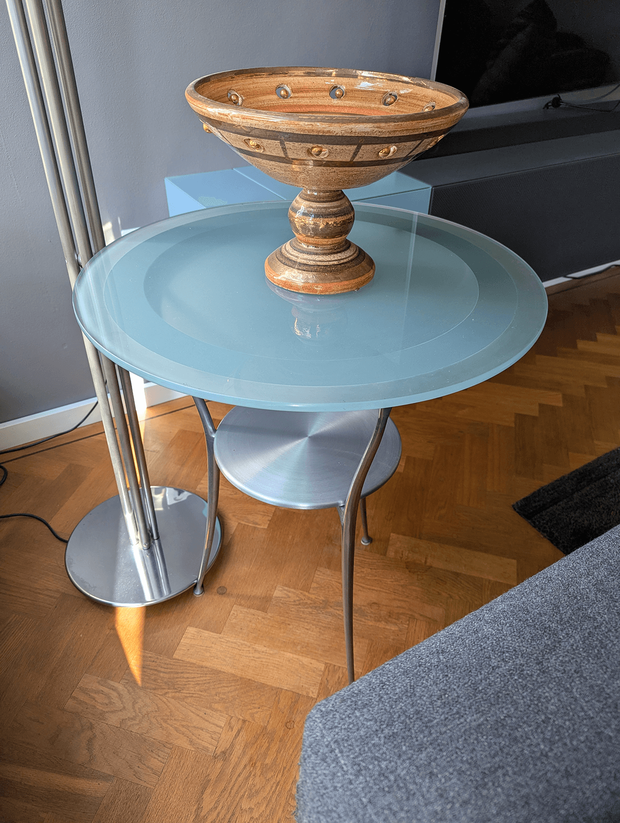 De tafel combineert een rond blad van melkglas met een extra ronde onderplank, beide gedragen door een lichtgrijs gelakt aluminium frame. Het ontwerp is luchtig en harmonieus, met gebogen poten en zorgvuldig afgewerkte details die deze tafel tot een stijlvol en functioneel meubelstuk maken.